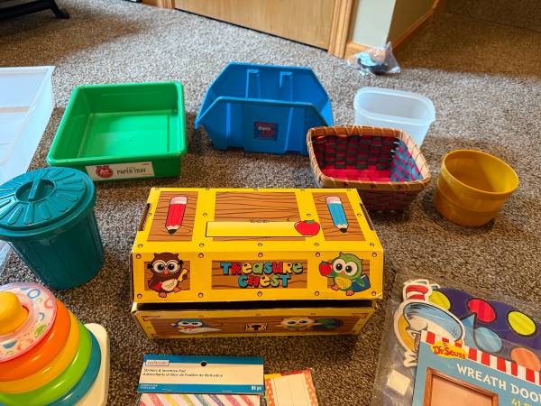 Various containers, toys, cards, brand new car notepads (all car pads for $1), Backstreet Boys bachelorette sign says “everybody yeah rock your body”, bride clip, brand new bachelorette “drink if” cards, brand new notepad, teen books, vintage books, etc.
